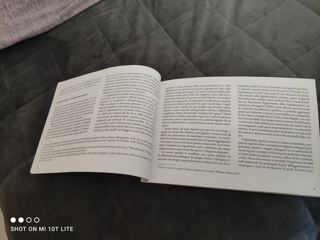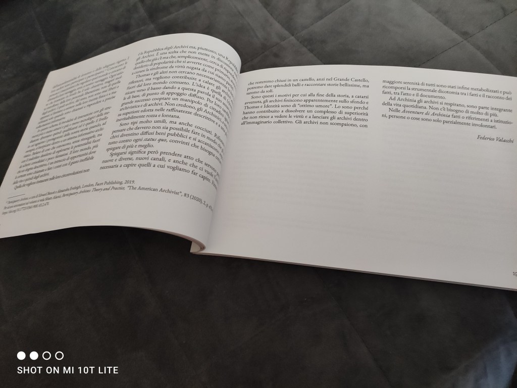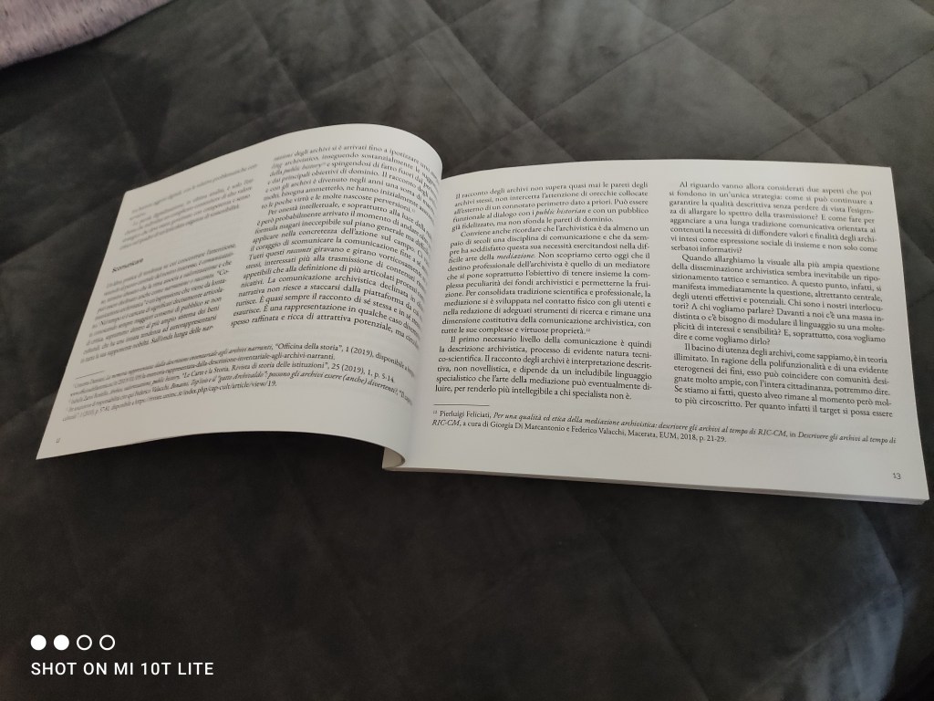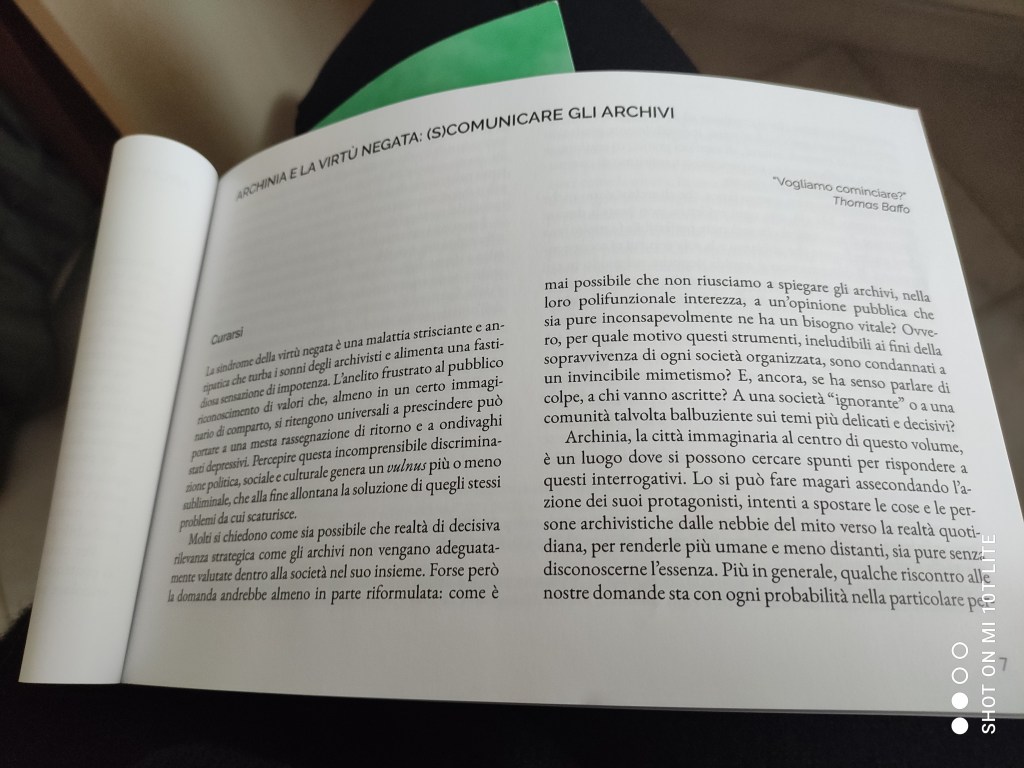 Per esempio, la premessa del Professor Valacchi intitolata Archinia e la virtù negata: (s)comunicare gli archivi si traccia una storia della figura dell’archivista, molto vicina a quella del copista, e come la digitalizzazione abbia fatto in modo che anche questa professione si sia evoluta negli anni.